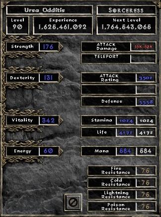 This section is somewhat of a boasting section, where I get to show off the Damage Sorceress that I am using, and how effective it has been. We'll start off with the Gear I have. You can click on any specific item in my Stash, Inventory, Person or Cube to see more information about it.